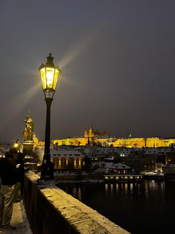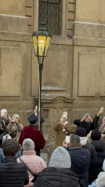 Na Vánoce 2025 jsem poprvé viděla pražského lampáře. Lampáři chodí jen během adventu a jen po Karlově mostě. Ručně tam rozvsěcují plynové lampy, které jsou po celé Královské cestě, ale jinde než na mostě se rozsvěcují dálkově.